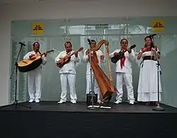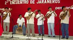 The instruments most commonly associated with son jarocho are the jarana jarocha, a small guitar-like instrument used to provide a harmonic base, with some double strings arranged in a variety of configurations; the requinto jarocho, another small guitar-like instrument plucked with a long pick traditionally made from cow-horn, usually tuned to a higher pitch and with a four or five thick nylon strings; the diatonic arpa jarocha; the leona, a type of acoustic bass guitar; the tarima, an idiophone percussion instrument that consists of a wooden platform on which people tap their heels,[3] and sometimes a minor complement of percussion instruments such as the pandero (especially in the style of Tlacotalpan), the quijada (an instrument made of a donkey or horse jawbone) or the güiro.[4] Some groups add the marimbol, a plucked key box bass, and the cajón (although the Peruvian version, not the Mexican cajón de tapeo).