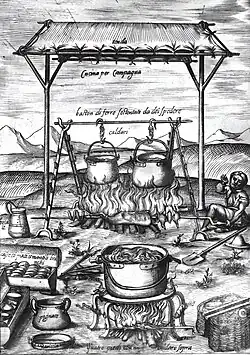Food preservation has, in Clarkson's phrase, "always been a preoccupation of the human animal",[122] allowing food to be kept for long periods. In her Domestic Cookery (1806), Maria Rundell gave a recipe for "Portable Soup – a very useful thing"[123] – highly concentrated meat stock that set to a solid consistency: for a bowl of soup it was only necessary to dissolve some in hot water.[124] By the beginning of the nineteenth century the Royal Navy had been victualling its ships with portable soup for some years.[125] Recipes were published under many names; Clarkson lists "veal glew", "cake soup", "cake gravey", "broth cakes", "solid soop", "portmanteau pottage", "pocket soup", "carry soup and "soop always in readiness".[126]