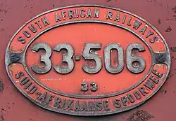 The two cabside number plates on Class 33-400 locomotives were not identical. Usually, all the locomotives in a Class would have either Afrikaans or English at the top of all their number plates. On the Class 33-400's number plates, the inscription was in Afrikaans at the top on the right hand or driver’s side, and in English at the top on the left hand or driver's assistant's side.