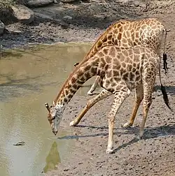 The South African giraffe or Cape giraffe (Giraffa giraffa[2] or Giraffa camelopardalis giraffa) is a species or subspecies of giraffe found in South Africa, Namibia, Botswana, Zimbabwe, Eswatini and Mozambique. It has rounded or blotched spots, some with star-like extensions on a light tan background, running down to the hooves.