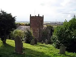 The Church of St Nicholas dates to the 13th century;[4] it is a structure consisting of nave, south transept, north porch and an embattled tower with pinnacles at the south-east corner containing 3 bells. Over the porch is tympanum, on which is a sculptured figure of St Nicholas, vested in alb and mitre and holding a pastoral staff in his left hand and on either side are symbolical figures of the Sun and Moon. The unusual north–south alignment of the current church is a legacy of a Victorian enlargements of the church. The Creed and Commandment boards survived in the vestry in the 1990s, and the present pulpit is a surviving element of the 18th century two- or three-decker pulpit dismantled during the 1870s reordering of the church. This was the chancel prior to the 1870s, the nave of the church having been rebuilt almost square following a landslip caused by water springs in the late 16th century.[5]