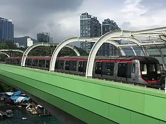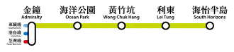 The South Island line (Chinese: 南港島綫) is a rapid transit line of Hong Kong's MTR metro system. This line connects the Hong Kong business district from Admiralty station to the Southern District of Hong Kong Island and the island of Ap Lei Chau, which was not served by any rail transport prior to the opening of the line.[2] Approved by the Executive Council in 2007,[3] the line commenced service on 28 December 2016.[4] It is indicated in Lime on the MTR map. The rolling stock of the South Island line is purpose-built for driverless operation, with trains being remotely controlled from the Operations Control Centre in Tsing Yi.