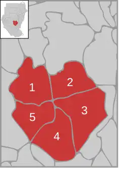 South Kordofan (Arabic: جنوب كردفان Ǧanūb Kurdufān) is one of the 18 wilayat or states of Sudan. It has an area of 158,355 km2[4] and an estimated population of approximately 2,107,623 people (2018 est).[5] Kaduqli is the capital of the state. It is centered on the Nuba Mountains. At one time it was supposed that South Kordofan was the only state in (North) Sudan suitable for producing oil, but oil has also been discovered in neighboring White Nile State in larger quantities.[6]