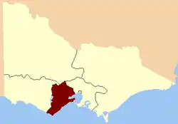 The area of South Western Province was defined in the Victoria Constitution Act, 1855, as "Including the Counties of Grant, Grenville, and Polwarth."[3] The Act came into effect in 1856.
