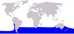 Southern right whale dolphins have a circumpolar distribution across the Southern Hemisphere, generally occurring in cool temperate to Sub-Antarctic waters between 30°S and 65°S.[16][5][14] The precise boundary of their range has not been estimated or closely studied but the southern limit of the species appears to be bounded by the Antarctic Convergence while the northern limit seems bounded by the Tropical Convergence although rare sightings beyond these limits have been recorded.[16] Most sightings of the southern right whale dolphins occur in offshore and deep waters, with temperatures ranging between 1 and 20 °C. In regions where deep waters approach the coast and in upwelling areas, they have occasionally been observed near shore.[17][5][11]