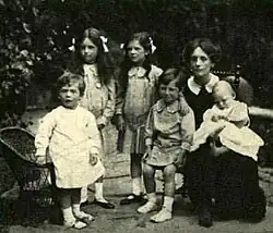 Emily Elizabeth Paulina Stewart-Jones (1843–1934) was born in 1843 in Devon. Her father was the Reverend William Thorold. In 1871 she married Edward Stewart-Jones[33] who was a property owner. The couple had two children – a son named Thorold and a daughter, Pauline. Edward died in 1900. When Emily bought Southover Grange in 1907 her son Thorold Arthur Stewart-Jones who was a barrister lived with her. He married Eva Joan Holland in 1908 and she also moved into the Grange. Over the next seven years the couple had five children. Unfortunately Thorold died in 1915 in the war. He was killed in action while leading a charge on the Western Front.[34] His wife Eva and the five children remained at Southover Grange with Emily. A picture of them at the house is shown. Emily sold the property in about 1920 and John Ernest Howarth Lomas bought the house.[35]