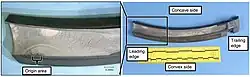 - The number-13 fan blade had separated at the root; the dovetail remained installed in the fan disk. Examination of the fan blade dovetail exhibited features consistent with metal fatigue initiating at the convex side near the leading edge. Two pieces of the fan blade were recovered from within the engine between the fan blades and the outlet guide vanes. One piece was part of the blade airfoil root that mated with the dovetail that remained in the fan disk; it was about 12 inches (30 cm) spanwise and full width and weighed about 6.825 pounds (3.096 kg). The other piece, identified as another part of the airfoil, measured about 2 inches (5 cm) spanwise, appeared to be full width, was twisted and weighed about 0.650 pounds (295 g). All the remaining fan blades exhibited a combination of trailing edge airfoil hard-body impact damage, trailing edge tears and missing material. Some also exhibited airfoil leading-edge tip curl or distortion. After the general in situ engine inspection was completed, the remaining fan blades were removed from the fan disk and an ultrasonic inspection was performed with no other cracks found.