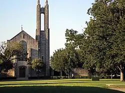 The Lois Perkins Chapel was built in 1950 and includes an Aeolian-Skinner pipe organ. Stained glass windows along the east and west sides depict Reformation leaders and Methodist leaders with seals for the educational institutions they were affiliated with.