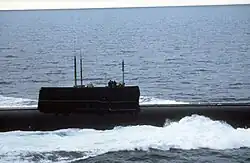 The submarine was powered by a pair of 177.4-megawatt (237,900 hp) VM-5M reactors, each supplying steam for the GTZA-618 steam turbine driving each propeller shaft. The turbines produced a total of 80,000 shaft horsepower (60,000 kW) that was intended to propel K-222 at a speed of 38 knots. The boat was equipped with two 3,000-kilowatt (4,000 shp) turbogenerators; two banks of 152-cell silver-zinc batteries were fitted in lieu of a diesel generator. The boat made 25 knots (46 km/h; 29 mph) on the surface,[8] and proved to be much faster than planned underwater and reached a top speed of 42 knots (78 km/h; 48 mph) at 90 percent power during her sea trials in December 1969. During this 12-hour full-speed test, some of the external hull fittings were ripped off and portions of the grills protecting the water intakes broke loose and were ground up by the water-circulation pumps.[6] One account of the trial wrote: