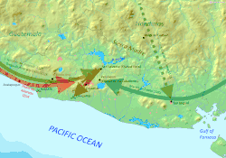 Six days after the battle, Alvarado marched northeast searching for the city of Tacuzcalco,[52] some 8 kilometres (5.0 mi) from Acajutla,[53] in the modern department of Sonsonate.[54] Pedro de Portocarrero led a group of mounted scouts that managed to capture two native lookouts, from whom they learned that a large native army had gathered near the city, with forces gathered from the surrounding area. The Spanish scouts advanced until they found the enemy, then waited for the vanguard of forty cavalry led by Gonzalo de Alvarado. Pedro de Alvarado was travelling in the rearguard, slowed by his wounds. Alvarado watched the battle unfold from a nearby viewpoint, and left command in the hands of his brothers. He sent Gómez de Alvarado with twenty cavalry to attack the left flank, and Gonzalo de Alvarado with thirty cavalry against the right flank. He sent Jorge de Alvarado with the rest of his men against a mass of warriors that was still distant but they stood off for a time, believing that the two forces were separated by a swamp. As soon as the Spanish discovered that the apparent swamp was in fact solid ground, they charged the enemy and routed them, killing a great many.[55] After this battle, the Pipil refused to confront the Spanish upon an open battlefield, and resorted to guerilla tactics.[53]