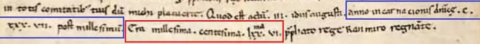 The Spanish era (Latin: Æra Hispanica), sometimes called the era of Caesar, was a calendar era (year numbering system) commonly used in the states of the Iberian Peninsula from the 5th century until the 15th, when it was phased out in favour of the Anno Domini (AD) system.[1] The epoch (start date) of the Spanish era was 1 January 38 BC.[2][1] To convert an Anno Domini date to the corresponding year in the Spanish era, add 38 to the Anno Domini year,[2] such that Era 941 would be equivalent to AD 903. A date given in the Spanish era always uses the word era followed by a feminine ordinal number (when written out instead of given in Roman numerals). This contrasts with the AD system that uses the masculine anno (year): i.e., era millesima octava versus anno millesimo octavo.[1]