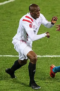 Mbia scored with a back-heel in the first leg of their Europa League semi-final against compatriots Valencia on 24 April 2014 in a 2–0 home win.[12] In the second leg on 1 May, he scored the winning away goal with a header in the fourth minute of added time to take Sevilla into the final.[13] Sevilla subsequently won the final in a shootout against Benfica at the Juventus Stadium in Turin on 14 May, with Mbia converting his penalty kick after the match had ended 0—0.[14] On 3 June, Mbia was selected in the 18-man Europa League "Team of the Year" along with teammates Ivan Rakitić, Nicolás Pareja and Beto.[15] At the LFP Awards, he was a nominee for the league's best African player, alongside the Granada duo of Yacine Brahimi and Youssef El-Arabi.[16]
