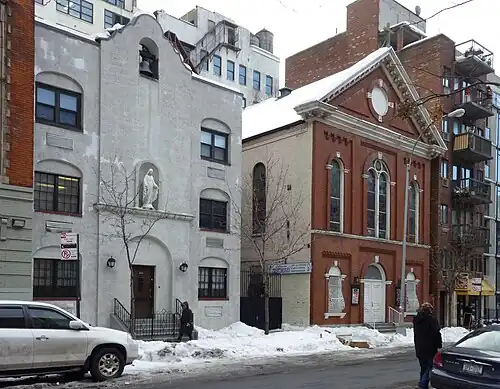In 1883 a Black Catholic mission parish named after St. Benedict the Moor was established, based on a $5,000 bequest by Fr Thomas Farrell to serve the African-American community in Lower Manhattan; his will and testament specified that if the Catholic Church was unable to spend funds for this purpose, it would instead go to the Protestant Colored Orphan Asylum.[4][5][6] It was the first church in the city for black Catholics[7] and the first north of the Mason–Dixon line.[2]