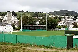 The old grandstand was demolished at the turn of the twenty-first century and replaced by a concrete and metal structure which has a seating capacity of approximately 200.[6] The only other cover at the ground is provided by a breezeblock and timber lean-to behind the near goal. Directly next to that is the large clubhouse, built in 1972, which leads out onto the car park. Blaise Park was the first sports ground in Cornwall to install floodlights in the late 1950s. They were paid for through a scheme of £1 shares and erected by voluntary labour.[6] They were replaced in November 1989 and inaugurated with a friendly match against Football League club Plymouth Argyle. The stadium is joined to Station Road, which in turn feeds onto the A390, one of the major roads in the county. The nearest train station is Par, approximately one mile away, which provides direct transport to Truro, Plymouth, and London.
