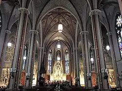 St. Francis de Sales parish was formed in 1867 to serve a growing German Catholic community,[2] whose members, at that time, were attending the church of Saints Peter and Paul in Soulard. The cornerstone was laid on September 15, 1867. During the ceremony a stand collapsed due to vandals having sawed some of the supporting timbers the previous night. No one was seriously injured. Although the church was still under construction, the first Mass was celebrated that Christmas. The building was dedicated the following May, by which time the church had 800 members. It is dedicated in honor of Saint Francis de Sales (d. 1622), bishop and doctor of the Church. The parish developed schools on its campus for Catholic children of elementary and high school levels. Given the majority ethnic German parish, for many years the sermon at Holy Mass was given in German. Classes at the school were also conducted in German.[3]