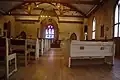 The inside of the present church is decorated with modern stained glass which can be seen behind the altar, at the back of the church, and adorning the doors.