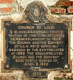 Liliw was established as a reduccion by Franciscan priests Juan de Plasencia and Diego Oropesa in 1578.[1] It was annexed as a visita of Nagcarlan until it became an independent parish with Miguel de San Lucas as first parish priest in 1605 by the Franciscan missionaries. The first church was built in wood in 1620. A stronger stone church was built from 1643 to 1646 and was partially destroyed during the 1880 Luzon earthquake.[2] It was reconstructed in 1885 and was partially burned on April 6, 1898.[3]