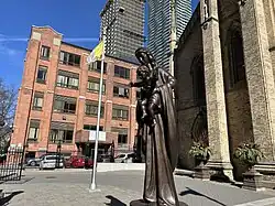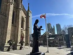 St. Michael's Cathedral is a major building of faith in downtown Toronto. It was originally constructed away from the city's centre, but over time the city has grown to encompass it. It was constructed to better serve the growing Roman Catholic population of Toronto. It is a prime example of the English Gothic Revival style of architecture. On September 29, 2016, the feast day of Saint Michael the Archangel, the cathedral was elevated to a minor basilica.[4]