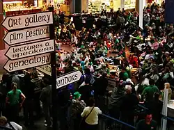 Butte, Montana's mining history brought in a large population of Irish immigrants, to the point that Gaelic was spoken as a common language in the mines and Butte had the highest percentage of Irish population of any city in America, including Boston.[60] Today, the city's population is under 40,000 people, and the annual St. Patrick's Day celebration brings in roughly 30,000 visitors each year, nearly doubling the city's population for the day. Butte has a long history of running a parade through the Uptown District of the city and hosting music at a number of venues, including numerous bars, including one featuring booths created from church pews that had been imported from Dublin and a stone imported from County Clare at the door for visitors to touch.[61] Until 2013 there was no open container law in Butte, and the current ordinance only prohibits open containers between 2:00 am and 8:00 am.[62] The day's events have a reputation for rowdy celebrations.[63]