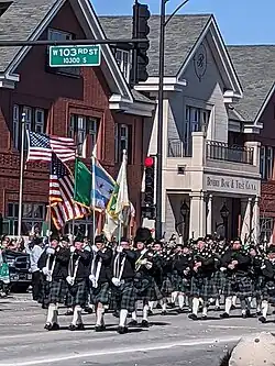 Although the Irish are present throughout the city of Chicago, the South Side neighborhoods of Beverly, Bridgeport, Morgan Park, and Mount Greenwood, along with the adjacent suburbs of Blue Island, Alsip, Merrionette Park, and Oak Lawn, have historically had large Irish-Catholic populations and comprise the ethnic enclave known as the "South Side Irish." Members of the community have long had an influential role in the politics and economy of the city. The area's heritage is celebrated in song (South Side Irish by Terry McEldowney[68]) and in the annual South Side Irish parade. This parade has been more closely associated with people of Irish heritage than the downtown celebration, with has become a popular activity attended by people of all backgrounds. It features traditional Irish dancers, as well as various businesses and organisations from around the city. This parade has been scaled back in recent years as the Saint Patrick's Day committee announced that it was becoming too large for the community to handle. In 2010, the South Side Parade was suspended. Due in part to pressure from community businesses—particularly pubs and package goods stores—as well as local churches on the city, the parade was reinstated in 2012. Of the various St. Patrick's Day parades in Chicago, the South Side parade has taken steps over the years to keep things family friendly and currently has a zero tolerance policy for public alcohol consumption while attending the parade.[69] The 2020 and 2021 parades were canceled due to the COVID-19 pandemic. The parade resumed in March 2022.[54]