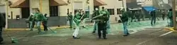 Seattle and other cities paint the traffic stripe of their parade routes green. Chicago dyes its river green and has done so since 1962 when sewer workers used green dye to check for sewer discharges and had the idea to turn the river green for Saint Patrick's Day. Originally 100 pounds of vegetable dye was used to turn the river green for a whole week but now only forty pounds of dye is used and the color only lasts for several hours.[23] Indianapolis also dyes its main canal green. Savannah dyes its downtown city fountains green. Missouri University of Science and Technology - St Pat's Board Alumni paint 12 city blocks kelly green with mops before the annual parade. In Jamestown, New York, the Chadakoin River (a small tributary that connects Conewango Creek with its source at Chautauqua Lake) is dyed green each year.[24]