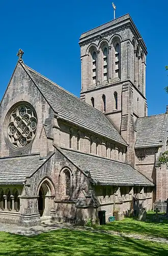 For such a small parish, having a population of only 166 residents (2011 estimate[12]), the present church is of substantial size, giving it the nickname of the "Cathedral of the Purbecks". The building is cruciform in plan, with a four-bay aisled nave, transepts, apse, and central tower. The west end begins with a lean-to narthex which runs the full width of the nave.[2] Above the narthex is a large rose window, some 12 feet (3.7 metres)[4] in diameter, formed of 21 individual segments.[13] The nave aisles both finish with single lancet windows and feature four pairs of smaller lancet windows, separated by buttresses, along the length of the nave. The nave clerestory above is similar in plan, with four pairs of slightly larger lancet windows with smaller buttresses.[2]