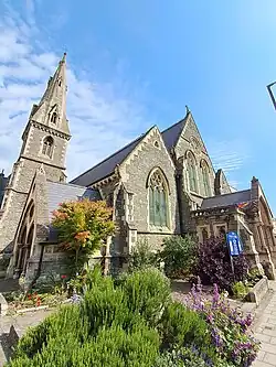 The current building largely dates from 1867, when it was rebuilt following a fire, using a variety of stones. The architect was Charles Hansom, who lived locally at the time, following his work on Clifton College.[2][3] Hansom was able to retain the tower and spire by Manners and Gill from the original building.[4] The church is listed Grade II and is notable for its stained glass windows and mosaics lining the walls, and especially the reredos.