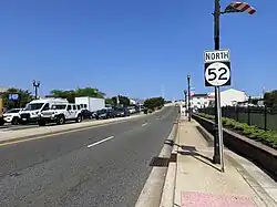 Route 52 is a New Jersey state highway that runs for 2.74 miles (4.41 km) from the island resort city of Ocean City, New Jersey along the Jersey Shore to the mainland town of Somers Point. It is part of a continuous roadway, which also includes two local roads, travelling from the Ocean City Boardwalk along the Atlantic Ocean to the Garden State Parkway in Somers Point. The road begins as 9th Street, a 0.67-mile (1.08 km) east–west collector and arterial road, which transverses the city.[3][4] Designation for Route 52 starts along 9th Street near the western shore of the island, at a point 0.09 miles (0.14 km) west of its intersection with CR 656 (Bay Avenue). The route begins as the Howard S. Stainton Memorial Causeway (also known as the 9th Street Bridge or the Route 52 Causeway),[5][6] a four-lane divided highway and causeway, which runs for 2.03 miles (3.27 km),[7] crossing four channels of Great Egg Harbor Bay with three interim salt marsh islands. The first crossing is the Intracoastal Waterway, followed by an island housing an Ocean City welcome center and a fishing pier, which are accessible via ramps in the southbound direction. The highway continues across Rainbow Channel and onto Rainbow Island, where an intersection leads to a parallel service road serving two additional fishing piers. After crossing Elbow Thoroughfare and a ship channel, Route 52 enters Somers Point, and comes to an intersection, formerly a traffic circle,[8] with CR 559 (Mays Landing Road) and CR 585 (Shore Road). The route continues as MacArthur Boulevard, a 0.63-mile (1.01 km) arterial road with a center left-turn lane, which transitions into a median as it approaches its terminus at an intersection with US 9 (New Road).[1] The road continues past the intersection to the northwest as West Laurel Drive for 0.65 miles (1.05 km), which travels through a residential neighborhood before terminating at a partial interchange with the Garden State Parkway.[9]