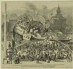 On July 30, 1871, Westfield II was damaged when its boiler exploded while sitting in its slip at South Ferry in Manhattan.[34][32][35] Within days of the disaster, between 45 and 91 had died, and from 78 to 208 listed as injured, although figures varied widely between the Times, Herald, Tribune, and World.[32][36] Among those injured was Antonio Meucci, an Italian immigrant who was developing the first telephone at the time; he was so poor that his wife sold his lab and telephone prototype to buy $6 worth of medications.[37] Jacob Vanderbilt was arrested for murder, though he escaped conviction.[38] This had an adverse effect on the railroad's finances;[38] and on March 28, 1872, the railway and the ferry went into receivership.[38][39] On September 17, 1872, the property of the company was sold to George Law in foreclosure,[38] with the exception of the ferryboat Westfield II, which was purchased by Horace Theall.[29]