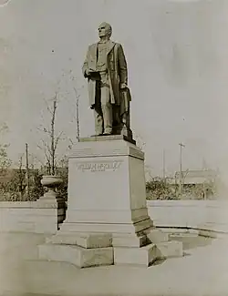 William McKinley was an American politician who served as the 25th president of the United States, first being elected in 1896. In 1901, he was assassinated in Buffalo, New York, during a world's fair held in the city. Following his death, there was a period of national mourning, and in Chicago, park commissioners acquired the site of the former Brighton Park Race Track for the purposes of converting it to McKinley Park in honor of him.[1] In 1902, it was decided that a statue of McKinley should be present in the park, and in an effort to save money, park officials decided to recast an old statue of Christopher Columbus that had been erected in Grant Park during the 1893 World's Columbian Exposition. From its debut, the statue had been criticized from an aesthetics standpoint, and by 1897, it had been relocated to a place of storage in Washington Park. While the town of Menasha, Wisconsin had offered to take the statue from the city, park officials ultimately decided to recast 10 tons of bronze from that statue into the McKinley statue, reducing the cost from $6,000 to $3,500.[2] The monument, designed by sculptor Charles Mulligan, was dedicated on July 4, 1905.[3] Federal judge Peter S. Grosscup gave a speech at the ceremony.[4]