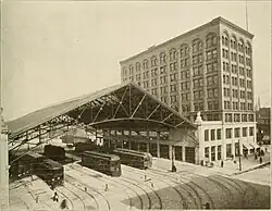 On January 1, 1900, the first interurban arrived in Indianapolis from Greenwood, Indiana. To accommodate the growing popularity of interurban travel, the Indianapolis Traction Terminal opened in September 1904, serving all but one of the 13 interurban lines converging in the city.[7] As the busiest interurban station in the world, the Indianapolis Traction Terminal was the hub for Indiana's extensive 1,825-mile (2,937 km) interurban network.[8] At the height of ridership, the terminal served more than 600 trains daily and seven million passengers annually. As automobiles became increasingly prevalent, the interurbans' popularity waned. The terminal served its last interurban in September 1941.[6]