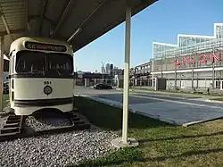 Kansas City Public Service streetcar 551 is a PCC (President's Conference Committee) streetcar preserved for static display in the River Market neighborhood. It was built in 1947 by the St. Louis Car Company for service in Kansas City. When the city closed its streetcar service, it was sold to the Toronto Transit Commission in 1957 and became TTC 4762. In 1973, the streetcar was sold to the San Francisco Municipal Railway, renumbered as Muni 1190 and ran as a tourist attraction. In 1979, the streetcar was sold to the Western Railway Museum remaining as Muni 1190. In 2006, KC Regional Transit Alliance purchased the streetcar, restored it as KCPS 551 and put it on static display at Union Station.[15] In 2016, the streetcar was put into storage because its Union Station site was repurposed. Finally, in 2017 the streetcar was moved again for display in River Market along the modern KC Streetcar line.[16]