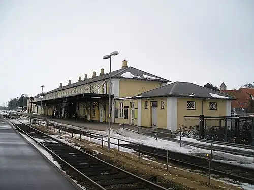 Struer station is an important railway junction where the Langå-Struer Line, the Esbjerg-Struer Line and the Thy Line from Struer to Thisted meet. The station was opened in 1865 with the opening of the Skive-Struer section of the Langå-Struer Line.[6] It offers direct InterCityLyn services to Copenhagen as well as regional train services to Aarhus, Fredericia, Skjern and Thisted. The train services are operated by GoCollective and DSB.