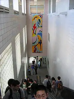 Stuyvesant's principal at the time, Abraham Baumel, visited the country's most advanced laboratories to gather ideas about what to include in the new Stuyvesant building's 12 laboratory rooms. The new 10-story building also included banks of escalators, glass-walled studios on the roof, and a shorter four-story northern wing with a swimming pool, five gymnasiums, and an auditorium.[44] Construction began in 1989. When it finally opened five years later in 1992, the building was New York City's first new high school building in ten years. The new downtown Stuyvesant Campus cost $150 million, making it the most expensive high school building ever built in the city at the time.[18] The S.H.S. Library has a capacity of 40,000 volumes and overlooks Battery Park City.[46]