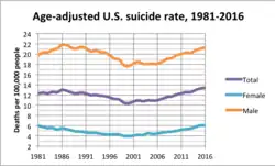 - ^ "Data Brief 241: Increase in Suicide in the United States, 1999–2014 : Data table for Figure 1. Age-adjusted suicide rates, by sex: United States, 1999–2014" (PDF). Centers for Disease Control and Prevention. Retrieved November 9, 2017.