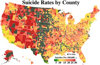 There are significant variations in the suicide rates of the different states.[16] A number of theories for these differences have been suggested, ranging from socioeconomics (rural poverty) to access to firearms and social isolation (low population densities).[63] A 2011 study found a correlation between altitude above sea level and suicide.[64]