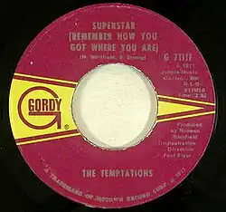 "Superstar (Remember How You Got Where You Are)" is a 1971 hit single for the Gordy (Motown) label, recorded by The Temptations and produced by Norman Whitfield. Something of an early ancestor to the "diss songs" prevalent in hip hop music towards the end of the 20th century, "Superstar" is an attack at two former Temptations members, David Ruffin (who had been fired back in 1968) and Eddie Kendricks (who quit the act in early 1971 and negotiated a Motown solo deal). The song appears on the 1972 album Solid Rock.