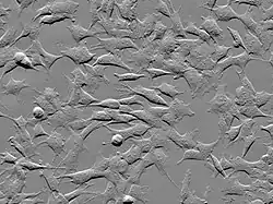 The history of suspension cell culture is closely tied to the overall history of cell and tissue culture. In 1885, Wilhelm Roux laid the groundwork for future tissue culture, by developing a saline buffer that was used to maintain living cells (chicken embryos) for a few days.[6] Ross Granville Harrison in 1907 then developed in vitro cell culture techniques, including modifying the hanging drop technique for nerve cells and introducing aseptic technique to the culture process.[7] Later in 1910, Montrose Thomas Burrows adapted Harrison's technique and collaborated with Alexis Carrel to establish multiple tissue cultures that could be maintained in vitro using fresh plasma combined with saline solutions.[8] Carrel went on to develop the first known cell line, a line derived from chicken embryo heart which was maintained continuously for 34 years.[9] Though the "immortality" of the cell line was later challenged by Leonard Hayflick, this was a major breakthrough and inspired others to pursue creating other cell lines.[10] Notably in 1952, George Otto Gay and his assistant Mary Kubicek cultured the first human derived immortalized cell line - HeLa. While the other cell lines were adherent, HeLa cells were able to be maintained in suspension.[11]