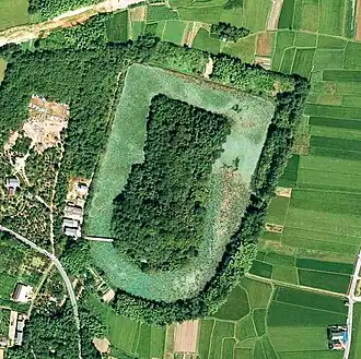 The Suyama Kofun is a zenpō-kōen-fun (前方後円墳), which is shaped like a keyhole, having one square end and one circular end, when viewed from above. It is facing north, but its central axis faces slightly northeast. A wide moat surrounds the mound, which is completely filled with water. The mound is built of earth in three tiers, and the slope of each tier steeper than the one before it. The slopes are covered with fukiishi consisting of andesite-based gravel and broken stones. Traces of rows of cylindrical haniwa clay figures have been found. Square projections are attached to the narrow part connecting the anterior and posterior sections. The total length of the tumulus is 202 meters,[8] making it one of a small handful of kofun tombs over 200 meters in length which were not administered by the Imperial Household Agency.[8] Subsequent archaeological excavations evealed a base stone 8 meters wide outside the base of the mound, revising its total length to 220 meters. The posterior circular mound has a diameter of 130 meters, and height of 25 meters; the anterior rectangular portion has a width of 112 meters, and height of 21 meters. The top of the circular mound is flat with a diameter of 45 meters. The moat is shield-shaped, and the width is 33 meters at the circular mound side, 37 meters at the front, and 57 meters around the narrow part. The outer bank of the moat is 27 meters wide at its widest point, and is built on parts of the south, east, and north sides, and is particularly high and wide on the east and northeast sides. Two pit-style stone burial chambers parallel to the main axis of the circular mound were excavated in the circular section, but they were looted during the Meiji period, and most of the many grave goods are now lost.[9]