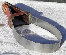 A sweat scraper is a tool used in horse grooming and with other animals, such as dogs. It consists of a handle and a rubber blade. Sweat scrapers are available in both metal and plastic form, and also traditionally in wood (as seen in Mongolia). It is used to remove sweat and/or excess hair from larger pets. It is used in much the same manner as a window cleaner would scrape water or foam from a window with a rubber blade. The typical use of a sweat scraper is to remove excess water after washing a horse to help it cool down rather than for just sweat.[1] Without the use of a sweat scraper, it would take more effort and additional rags to remove the same amount of excess water therefore the proper use of a sweat scraper helps to ensure an effective cool down process.