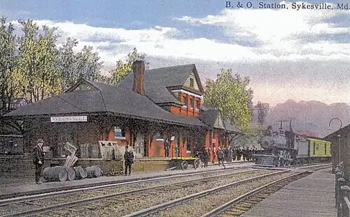 Sykesville station is a historic railway station was built by the Baltimore and Ohio Railroad's Old Main Line in 1831, located in the town of Sykesville, Maryland in Howard County on 7618 West Main Street. Sykesville had two side platforms, two railroad tracks, and a station building. The station was closed in 1950 and the station building is now a restaurant.