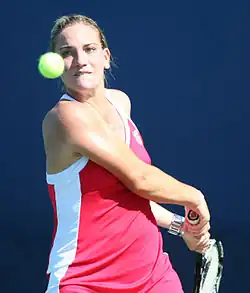 After years of weak singles performances, Babos, at the opening week, reached semifinal which she lost to Alison Riske.[24] Followed by second round of the Australian Open, quarterfinal of the St. Petersburg Trophy and third round of the Premier 5 Qatar Open.[31][32][33] At the Miami Open, she reached the round of 16 for the first time at some Premier 5/Mandatory tournament, missing her chance to reach the quarterfinal, losing to Angelique Kerber.[34] She continued, reaching the quarterfinal at the Katowice Open and semifinal at the Morocco Open.[35][36] At the Italian Open, she beat Venus Williams in the second round, before losing to Madison Keys.[37][38] In early August, she advanced to the Brasil Cup final, but lost to Irina-Camelia Begu.[39] She then reached her first Premier 5 quarterfinal at the Cincinnati Open, losing there to fourth seed Garbiñe Muguruza.[40] At the US Open, she reached third round for the first time at major event in singles, but then was defeated by seed Simona Halep.[41] So she made her top 30 debut, and in the following week, she climbed to her career-high singles ranking of 25.[42] In her last two singles tournaments, Babos reached the quarterfinal at the Kremlin Cup and then qualified for the first time for the year-end WTA Elite Trophy.[43] However, she lost in her round-robin group to Bacsinszky and Zhang Shuai.[44][45]