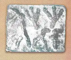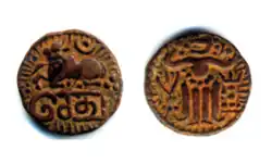 The legend is read as 'Ko Veta'. Ko means 'King' in Tamil and refers to a chieftain here. It is comparable to such names as Ko Ataṉ and Ko Putivira occurring in contemporary Tamil Brahmi inscriptions of ancient South India.[6][7][8] The Trident symbol is also found after a Tamil Brahmi inscription of the Chera dynasty supporting this interpretation.[9]