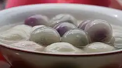 Tangyuan or tanguan are a traditional Chinese dessert made of glutinous rice shaped into balls that are served in a hot broth or syrup. They come in varying sizes, anything between a marble to a ping-pong ball,[1] and are sometimes stuffed with filling. Tangyuan are traditionally eaten during the Lantern Festival,[2] but because the name is a homophone for reunion (traditional Chinese: 團圓; simplified Chinese: 团圆; pinyin: tuányuán) and symbolizes togetherness and completeness, this dish is also served at weddings, family reunions, Chinese New Year, and the Dōngzhì (winter solstice) festival.[3]