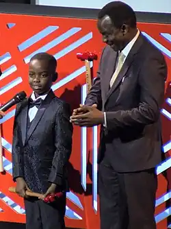![]() Adewumi (left), receiving 2019 Tribeca Disruptive Innovation award as his father applauds | |