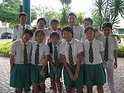 Boys wear white short-sleeved shirts with a school badge on the breast pocket. Lower Secondary boys wear white short trousers. Upper Secondary boys wear long white trousers. Girls wear a short-sleeved blouse with the school badge on the left. The skirt is jade-green with box pleats. A green and yellow striped tie is worn on some occasions.