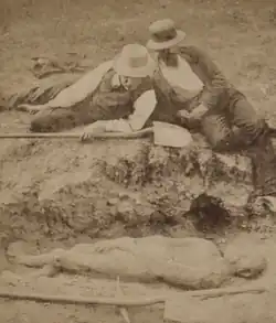 On July 2, 1879, workmen widening a carriage road near the Taughannock House Hotel uncovered what appeared to be the petrified body of a seven-foot-tall man. Newspapers reported on the find, and Cornell University scientists removed parts of the body for examination. Over 5,000 people paid a small admission fee to view the 800-pound "giant." Before long, the figure was revealed to be a hoax created by the hotel's owner, John Thompson, and two associates. The idea for the hoax had been inspired by the Cardiff Giant, a similar "discovery" in nearby Cardiff, New York in 1869.[10][11] Although the original giant has been damaged and lost,[12] a replica was constructed for the Tompkins Center for History & Culture by local artists in 2019.[13][14]