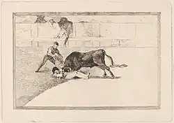 Bullfighting was not politically sensitive, and the series was published at the end of 1816 in an edition of 320—for sale individually or in sets—without incident. It did not meet with critical or commercial success.[1] Goya was always charmed by bullfighting, a theme that obviously inspired him, since it was the subject of many of his works: in a self-portrait (c 1790–1795) he depicted himself in a bullfighter's suit; in 1793 he completed a series of eight paintings on tinplate, created for the Royal Academy of Fine Arts of San Fernando, which depicted scenes from bulls' lives from the moment of their birth to the time they enter the bullring; in 1825 he made the series Los toros de Burdeos (The Bulls of Bordeaux; 1825), of which Delacroix purchased a copy.[2] Indicative of his love for bulls is the fact that he signed one of his letters as Francisco de los Toros (Francisco of the Bulls).[3][4]