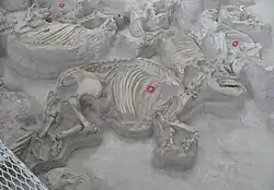 The greatest concentration of Ashfall fossils is housed in a building called the "Rhino Barn", due to the prevalence of T. major skeletons at the site, of which most were preserved in a nearly complete state. One extraordinary specimen includes the remains of a Teleoceras calf trying to suckle from its mother.[23]