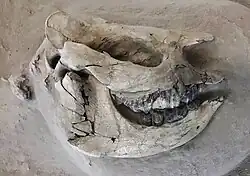 Teleoceras has high crowned (hypsodont) molar teeth, which has historically led to suggestions that the species were grazers. Dental microwear and mesowear analysis alternatively suggest a browsing or mixed feeding (both browsing and grazing) diet.[8][9] Whether or not Teleoceras was semi-aquatic had been debated by experts. Based on this description, Henry Fairfield Osborn suggested in 1898 that it was semi-aquatic and hippo-like in habits, however and oxygen isotope analysis of tooth enamel suggests hippo-like grazing habits, but not aquatic.[6][10] However, δ18O measurements from Ashfall suggest that the species T. major was semi-aquatic.[11][12][13] Further evidence of the dependence on water of T. major comes from combined studies of its enamel 87Sr/86Sr, δ13C, and δ18O, which show its lifetime movement patterns were mostly restricted to areas with high water availability.[14]